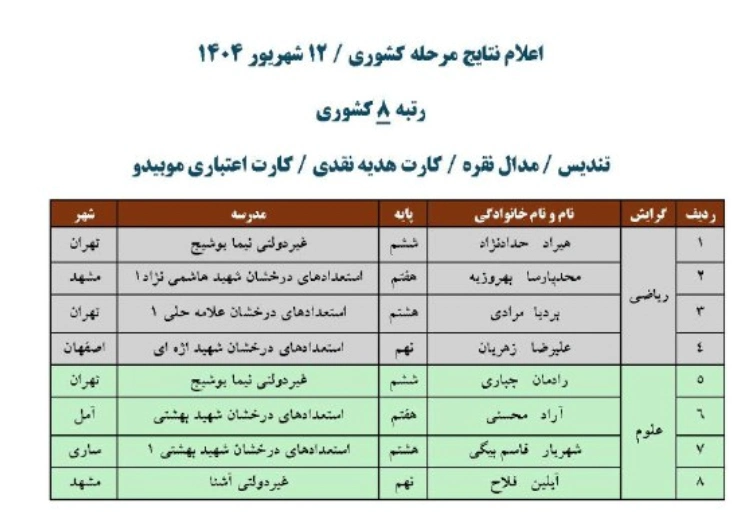 رتبه های ۱۱ به بعد – نقره کشوری (پارت دوم) پانزدهمین المپیادریاضی وهفتمین المپیاد علوم نوجوانان ایران – مبتکران